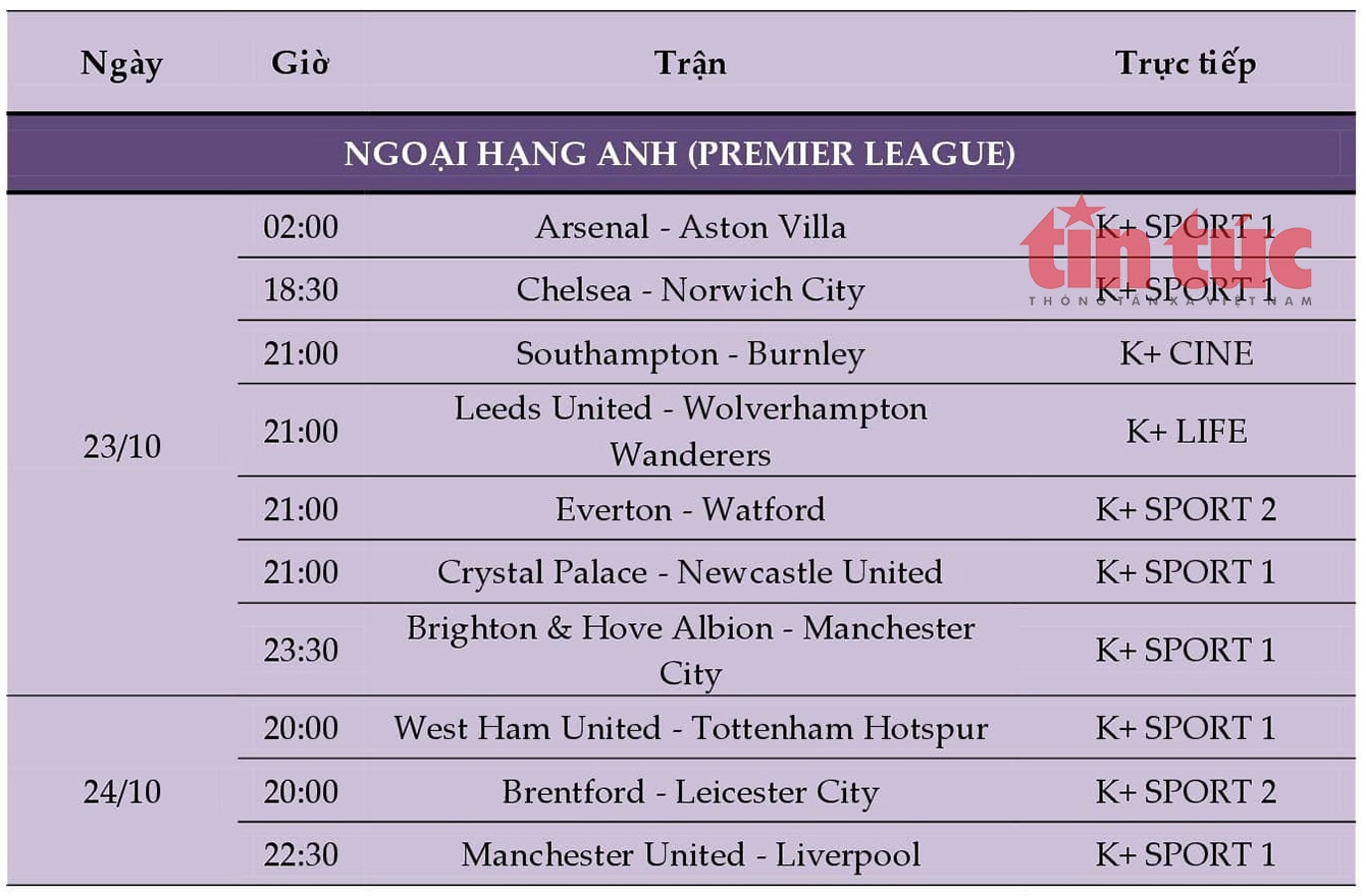 Toàn bộ lịch thi đấu bóng đá và truyền hình trực tiếp cuối tuần, từ 23 - 29/10/2021, được cập nhật mới nhất, chính xác nhất, đầy đủ nhất của các giải đấu.