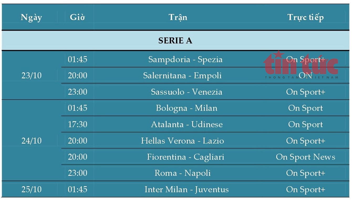 LỊCH THI ĐẤU BÓNG ĐÁ ITALIA (SERIE A)