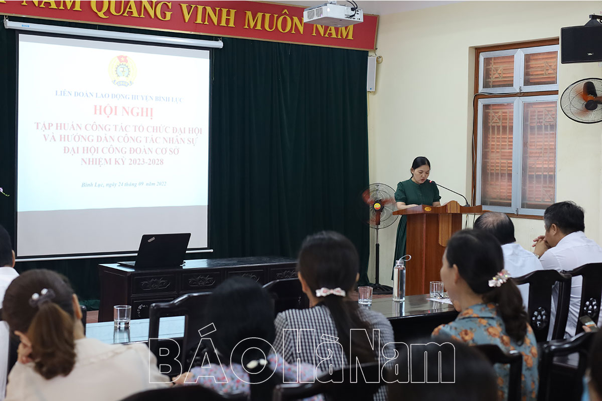 Thực hiện chương trình công tác năm 2022, sự chỉ đạo của Ban Thường vụ Liên đoàn Lao động (LĐLĐ) tỉnh, sáng 24/9, LĐLĐ huyện Bình Lục tổ chức hội nghị tập huấn công tác tổ chức đại hội và hướng dẫn công tác nhân sự ban chấp hành tại đại hội công đoàn cơ sở (CĐCS) nhiệm kỳ 2023-2028 cho các đồng chí là chủ tịch, phó chủ tịch các CĐCS trực thuộc.