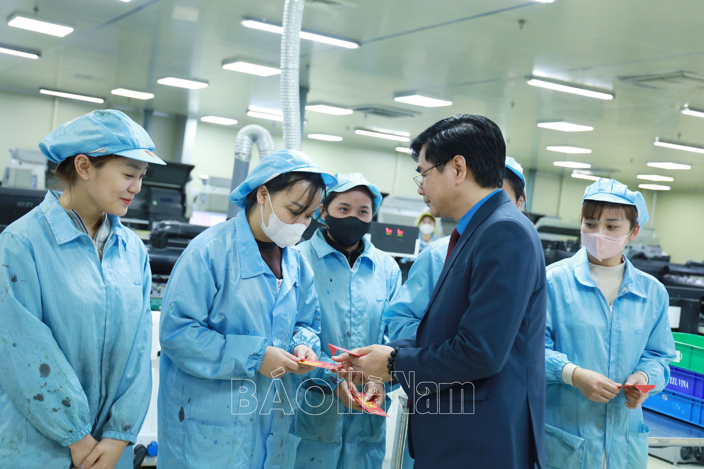 Lãnh đạo LĐLĐ tỉnh thăm hỏi, động viên người lao động Công ty TNHH Kangyin Electronic Technology trong ngày đầu xuân mới.