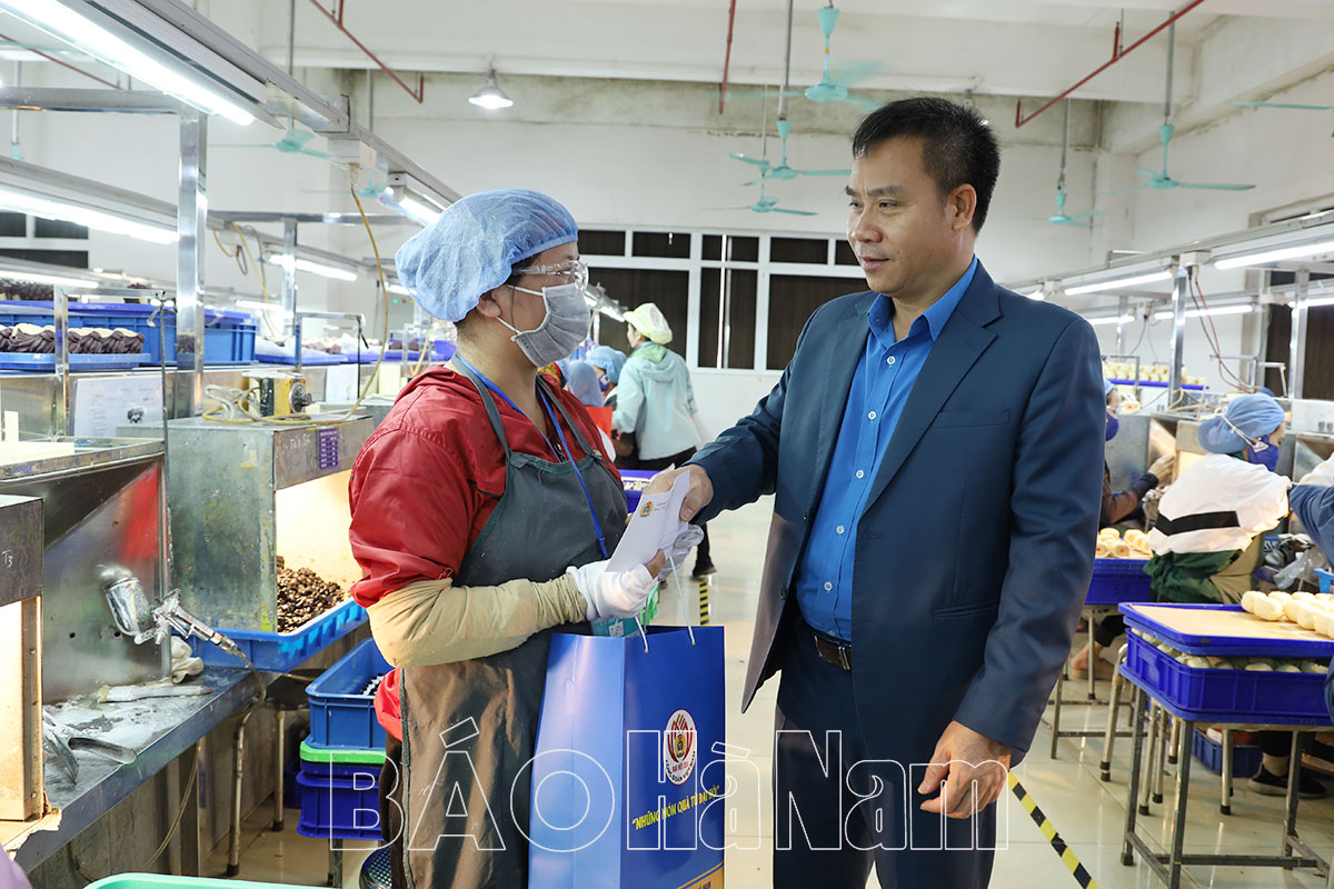 Lãnh đạo Công đoàn các Khu công nghiệp tỉnh trao tặng quà cho đoàn viên.Lãnh đạo LĐLĐ tỉnh thăm, tặng quà trực tiếp cho người lao động tại xưởng sản xuất.