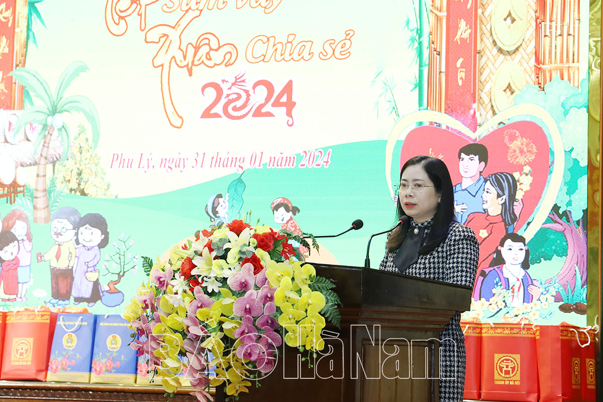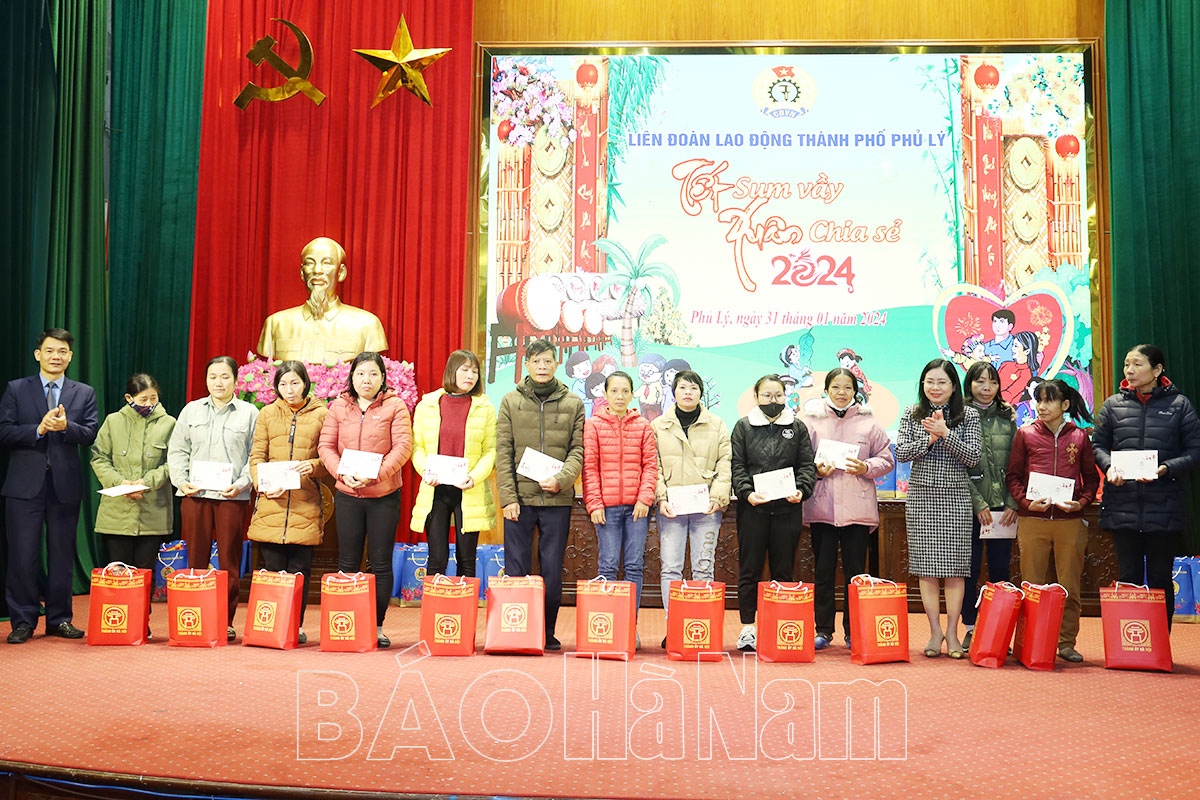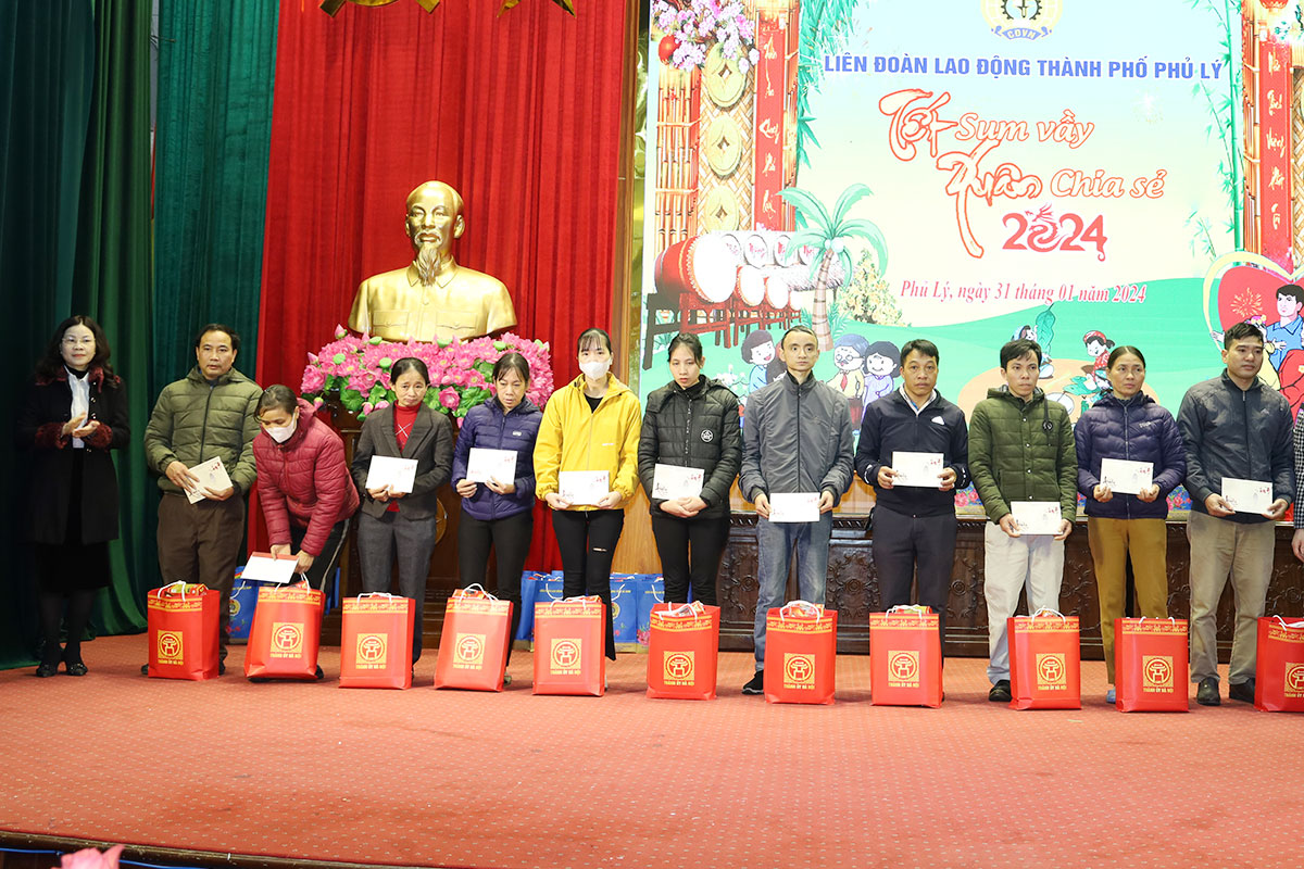 Đồng chí Nguyễn Đức Toàn, Ủy viên Ban Thường vụ Tỉnh ủy, Bí thư Thành ủy, Chủ tịch HĐND thành phố Phủ Lý tặng quà người lao động trên địa bàn thành phố Xuân Giáp Thìn 2024.Phó Chủ tịch LĐLĐ tỉnh Phạm Thị Thu Giang tặng quà đoàn viên khó khăn trên địa bàn thành phố Phủ Lý nhân dịp Tết Giáp Thìn.Người lao động trên địa bàn TP Phủ Lý được tặng quà tại chương trình "Tết sum vầy - Xuân chia sẻ" 2024 do LĐLĐ thành phố tổ chức.