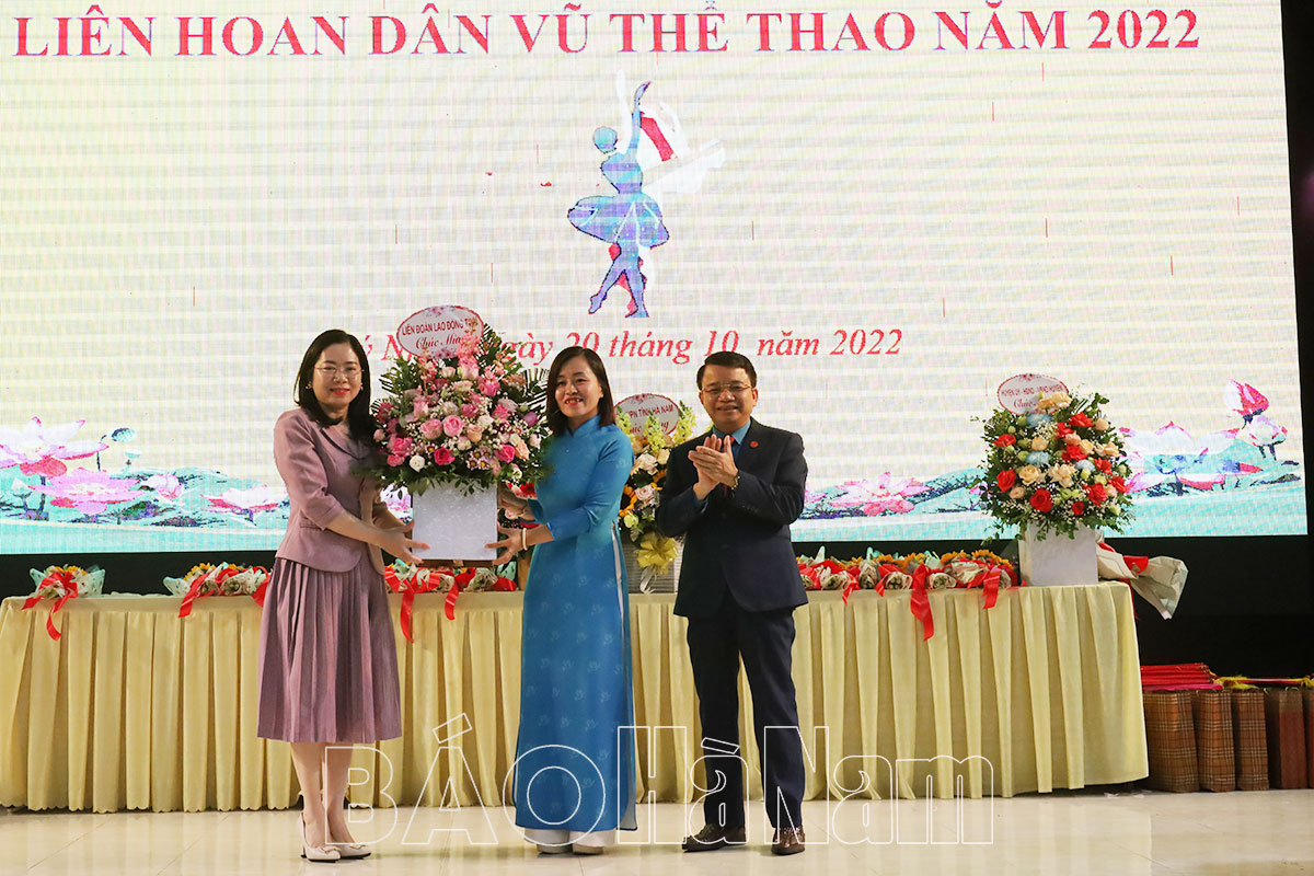 Lãnh đạo Liên đoàn Lao động tỉnh tặng hoa chúc mừng Liên hoan dân vũ thể thao huyện Lý Nhân năm 2022.