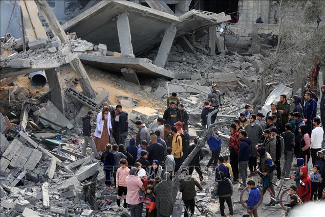 Người dân Palestine bên đống đổ nát của những tòa nhà bị phá hủy sau các cuộc không kích của Israel tại thành phố Rafah, Dải Gaza ngày 12/2/2024.