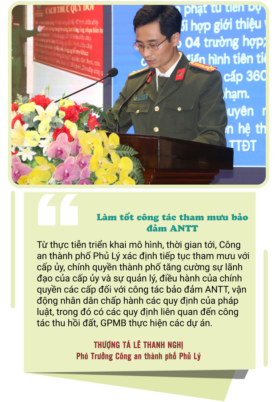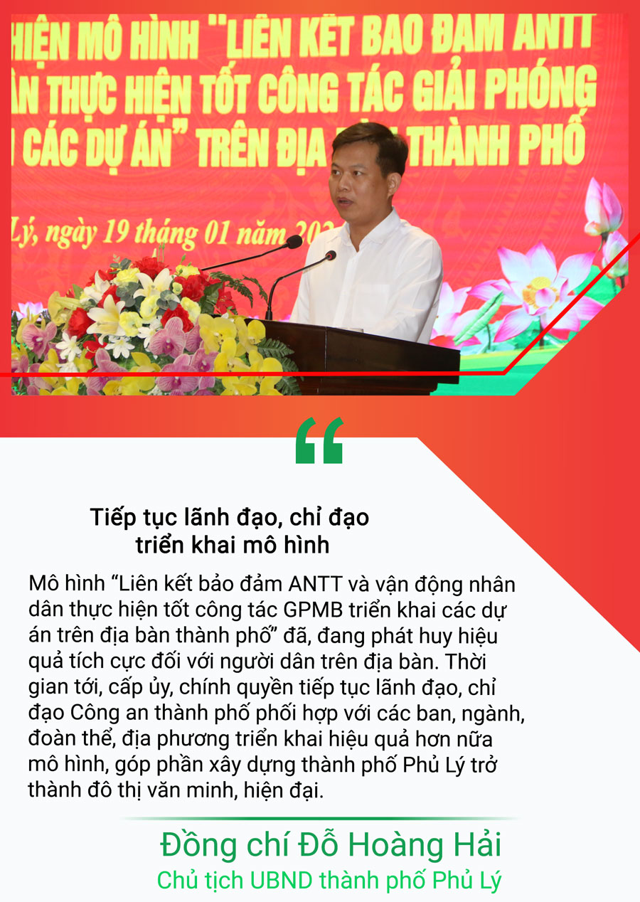 Nhận thức rõ điều đó, tháng 3/2022, Công an thành phố Phủ Lý cùng các ban, ngành, đoàn thể của thành phố đã tham mưu Thành ủy, UBND thành phố triển khai mô hình “Liên kết bảo đảm ANTT và vận động nhân dân thực hiện tốt công tác GPMB triển khai các dự án trên địa bàn”. Mô hình nhằm hướng đến mục tiêu nâng cao nhận thức, trách nhiệm của cấp ủy, chính quyền, các ngành, đoàn thể và quần chúng nhân dân về công tác xây dựng phong trào toàn dân bảo vệ an ninh Tổ quốc trong công tác bồi thường GPMB gắn với các nhiệm vụ chính trị - xã hội của địa phương. Đồng thời, tiếp tục huy động sức mạnh tổng hợp của cả hệ thống chính trị trong vận động cán bộ, nhân dân tích cực, tự giác tham gia bảo đảm ANTT; chấp hành các chế độ, chính sách bồi thường GPMB, xây dựng hạ tầng bảo đảm tiến độ, an toàn, không để xảy ra mất ANTT, góp phần hoàn thành dự án theo kế hoạch đề ra.