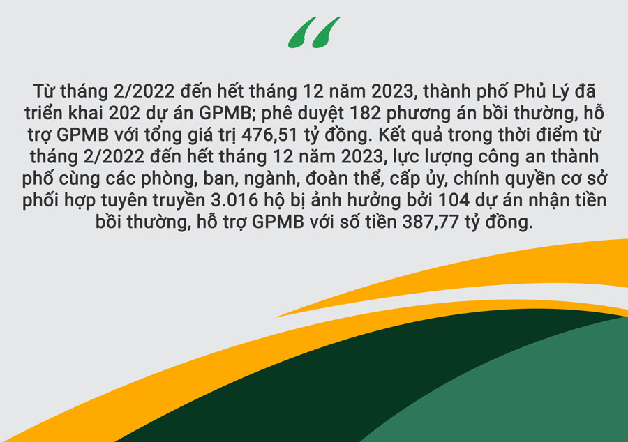 Theo báo cáo của UBND thành phố Phủ Lý, từ tháng 2/2022 đến hết tháng 12 năm 2023, thành phố Phủ Lý đã triển khai 202 dự án GPMB; phê duyệt 182 phương án bồi thường, hỗ trợ GPMB với tổng giá trị 476,51 tỷ đồng. Kết quả trong thời điểm từ tháng 2/2022 đến hết tháng 12 năm 2023, lực lượng công an thành phố cùng các ban, ngành, đoàn thể, cấp ủy, chính quyền cơ sở phối hợp tuyên truyền 3.016 hộ bị ảnh hưởng bởi 104 dự án nhận tiền bồi thường, hỗ trợ GPMB với số tiền 387,77 tỷ đồng.