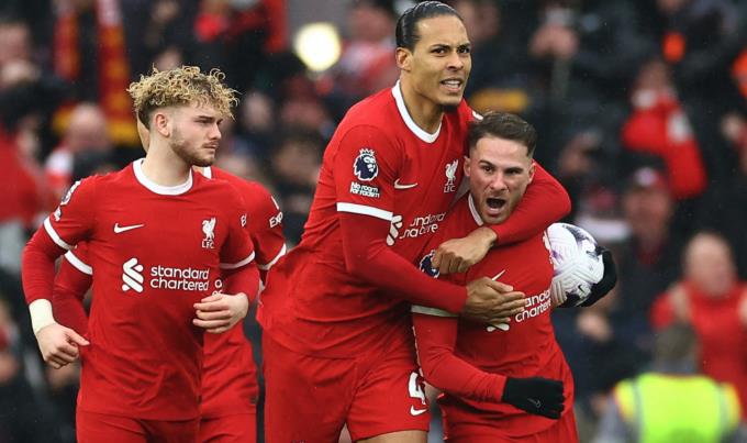 Mac Allister chia vui với Van Dijk sau khi gỡ hòa cho Liverpool trên chấm phạt đền.