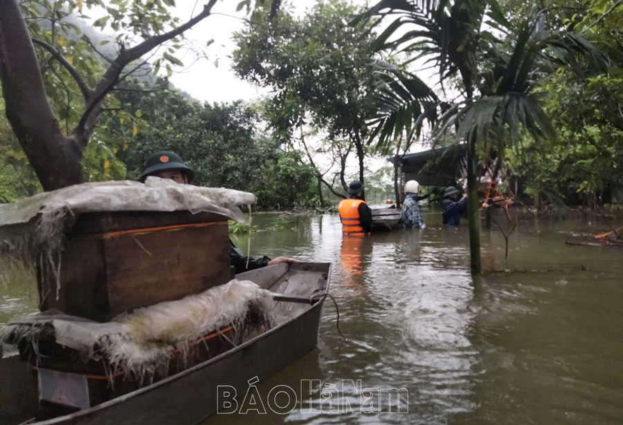Cán bộ, chiến sĩ Ban CHQS Kim Bảng phối hợp hỗ trợ di dời các hộ dân trong vùng ngập úng của xã Liên Sơn tới nơi an toàn.
