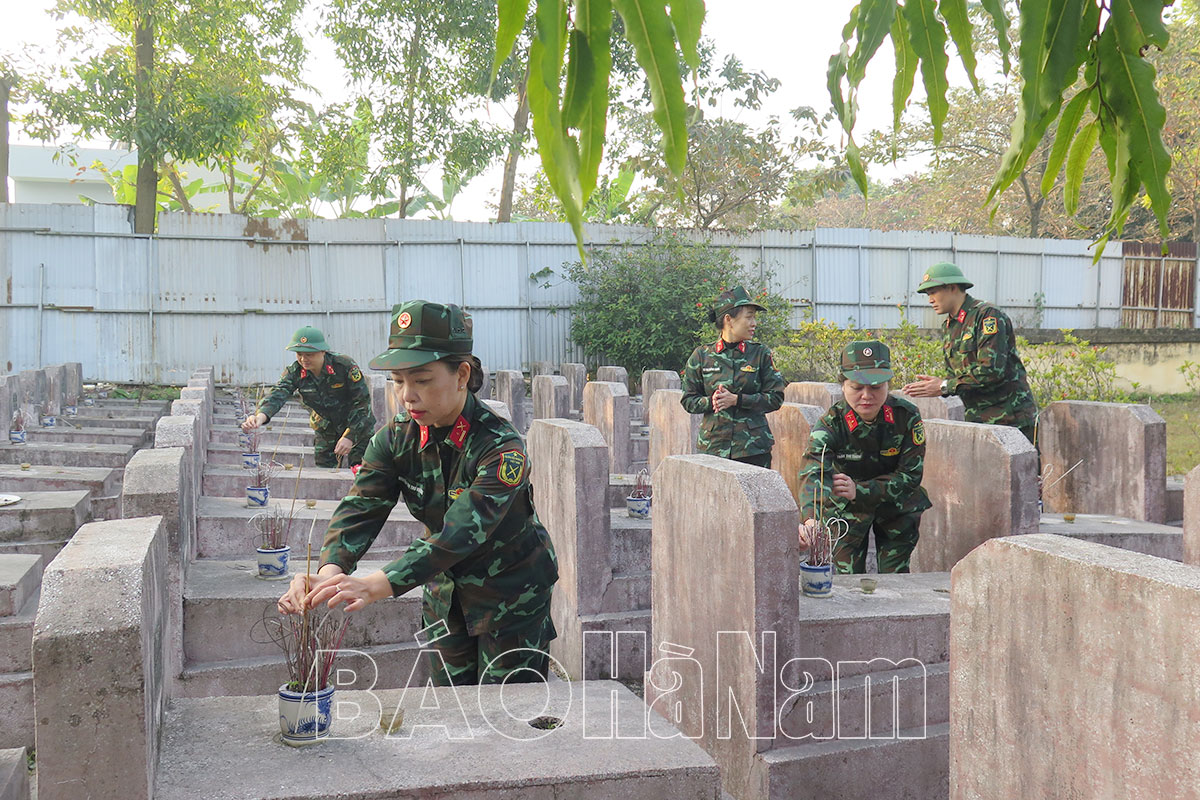 Cán bộ, chiến sĩ thực hiện phát quang cây cối, dọn vệ sinh khu vực nghĩa trang liệt sĩ xã.Chăm sóc, dọn vệ sinh các phần mộ tại nghĩa trang liệt sĩ xã.