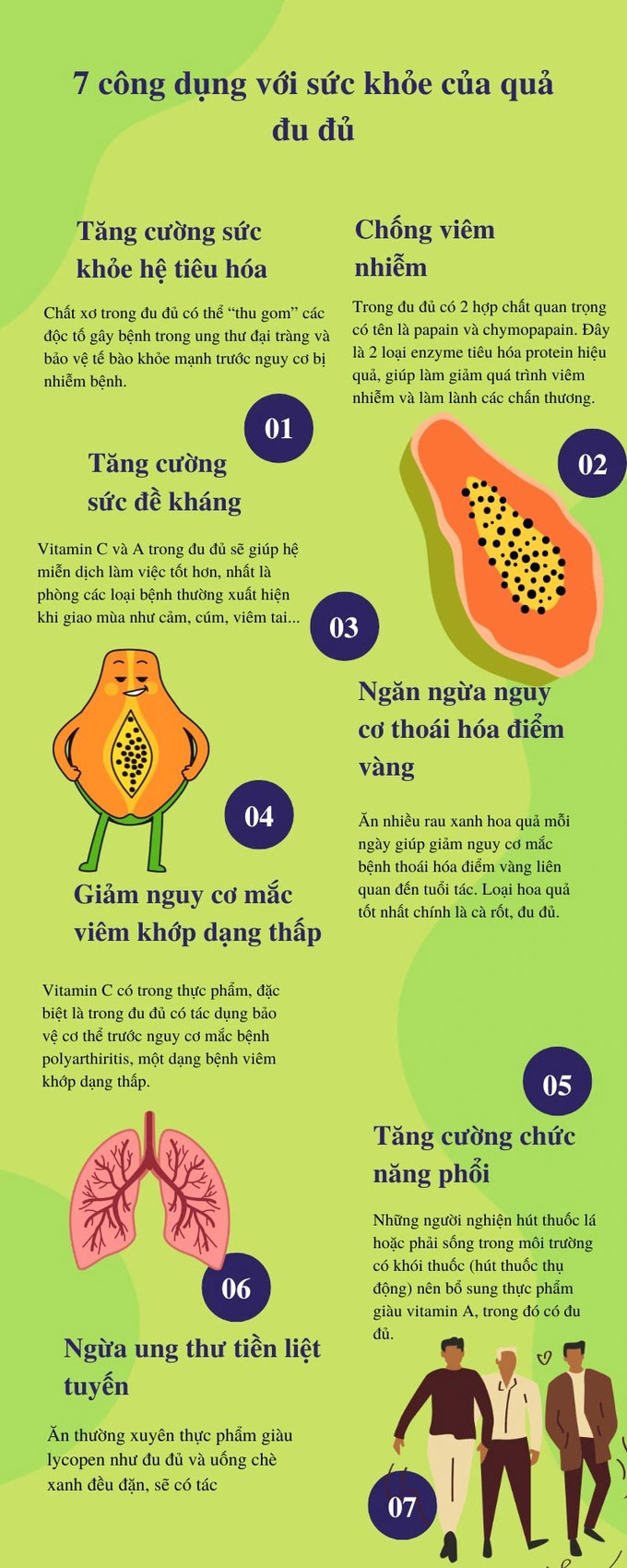 Đu đủ cũng chứa nhiều vitamin C, E và beta-carotene nên có tác dụng phòng ngừa viêm nhiễm ở mức cao nhất. Vì thế, những người bị bệnh hen suyễn, thấp khớp thường được bác sĩ kê đơn cho dùng các dưỡng chất nói trên.