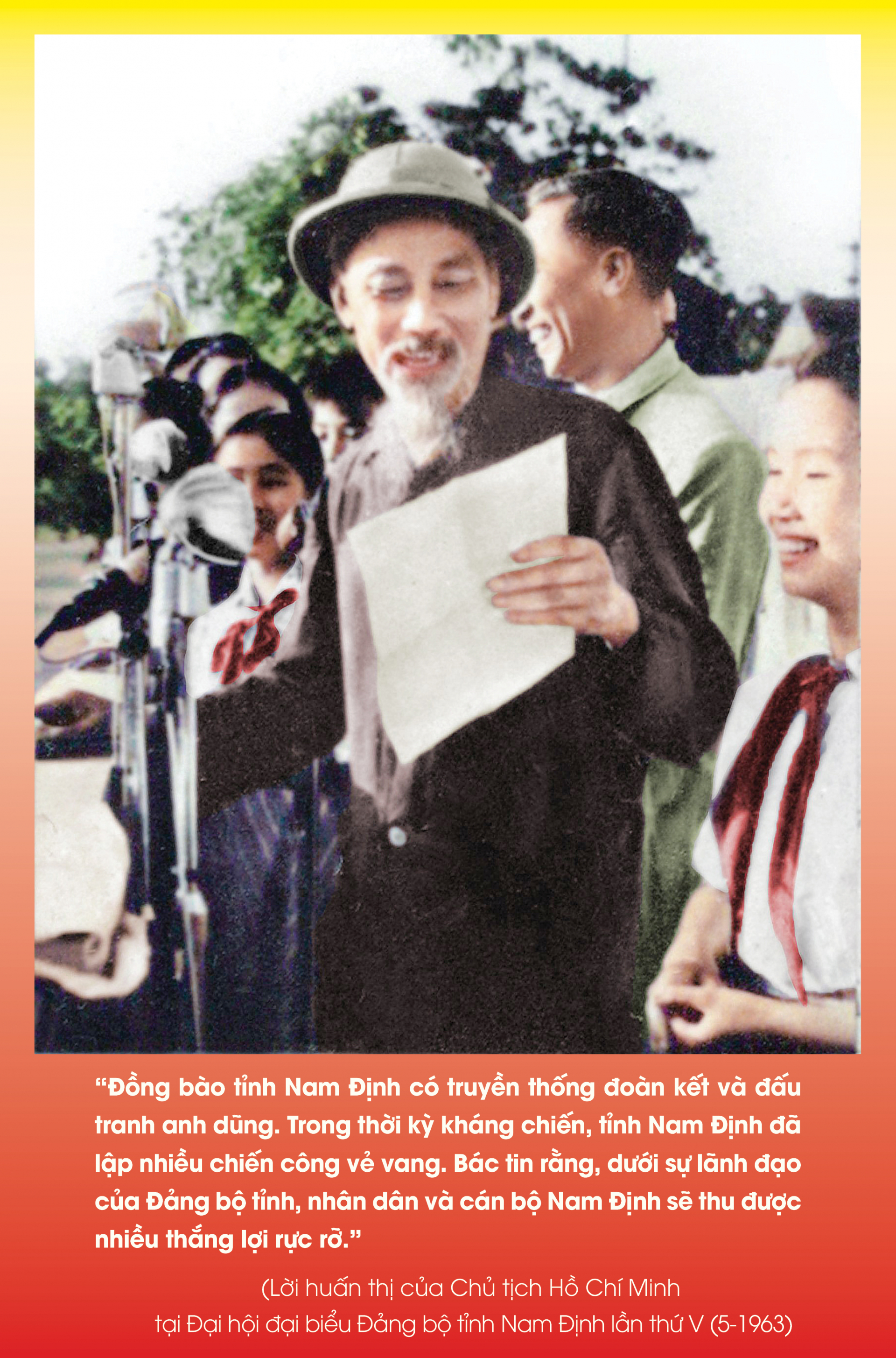 Từ năm 1946 đến năm 1963, Bác Hồ đã 5 lần về thăm và làm việc với Đảng bộ và nhân dân tỉnh Nam Định. Bác ân cần chỉ bảo, dặn dò cần phát huy tinh thần tiên phong, gương mẫu của đội ngũ cán bộ, đảng viên; chú trọng công tác xây dựng Đảng; phát triển nông nghiệp, nông thôn, nâng cao đời sống nhân dân và coi đó là vấn đề có ý nghĩa sống còn đối với sự nghiệp xây dựng, bảo vệ Tổ quốc. Thực hiện lời Bác dạy, qua mỗi giai đoạn lịch sử, Đảng bộ, quân và dân trong tỉnh luôn đoàn kết, quyết tâm vượt qua khó khăn, thách thức, vững bước tiến lên trong công cuộc đổi mới, theo đúng niềm mong ước của Bác: "Xây dựng tỉnh Nam Định thành một tỉnh giàu mạnh, làm kiểu mẫu cho toàn miền Bắc...".