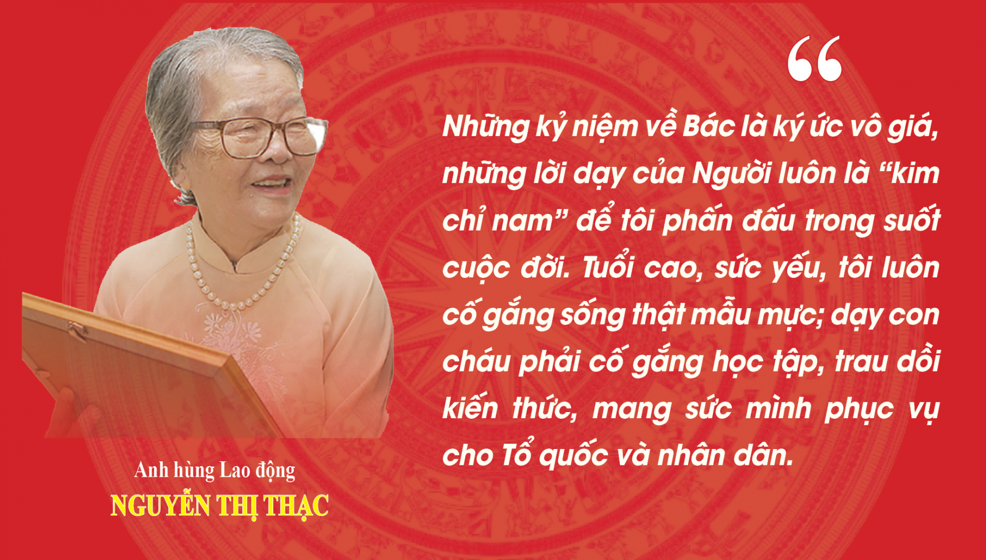 “Vinh dự và cũng là hạnh phúc lớn nhất của đời tôi là những lần được gặp Bác Hồ, được trực tiếp nghe Bác nói, Bác hỏi, Bác cǎn dặn và chỉ bảo… Tôi luôn ghi nhớ và nguyện phấn đấu suốt đời thực hiện lời Bác dạy”. Đó là lời tâm sự của Anh hùng Lao động Nguyễn Thị Thạc; người được mệnh danh “Kiện tướng đứng máy sợi” (Nhà máy Dệt Nam Định) những năm kháng chiến chống Mỹ, cứu nước.