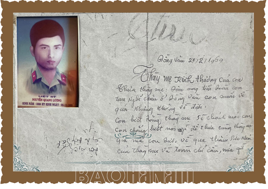 “Quê hương ơi, cho phép tôi được gửi lại lời chào, gửi gia đình tôi bao nỗi nhớ… Thầy mẹ ạ, sức con còn khỏe, con cứ đi sẽ đi đến cùng tận của Tổ quốc mà hiện Đảng đang cần đến…”. Trang thư đầy cảm xúc, chứa đựng biết bao tình cảm yêu thương tha thiết của một người đảng viên, người chiến sỹ cộng sản Nguyễn Quang Lương (xã Đại Cương, huyện Kim Bảng nay là phường Đại Cương, thị xã Kim Bảng) gửi lại cho gia đình và quê hương yêu dấu để vào chiến trường miền Nam chiến đấu vì sự nghiệp giành độc lập, tự do cho đất nước.