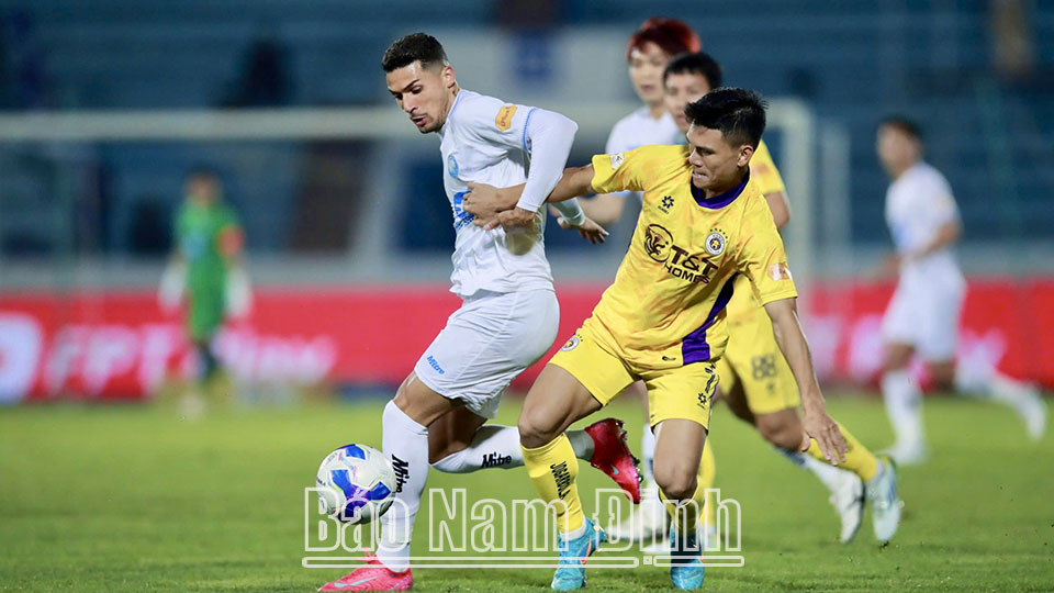 | Tình huống tranh chấp bóng giữa các cầu thủ Thép Xanh Nam Định và Hà Nội. |