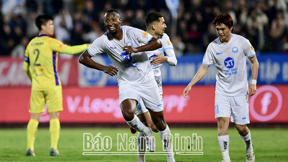 | Cầu thủ Caio Cesar ăn mừng sau khi ghi bàn thắng gỡ hoà 1-1 cho đội chủ nhà Thép Xanh Nam Định. |