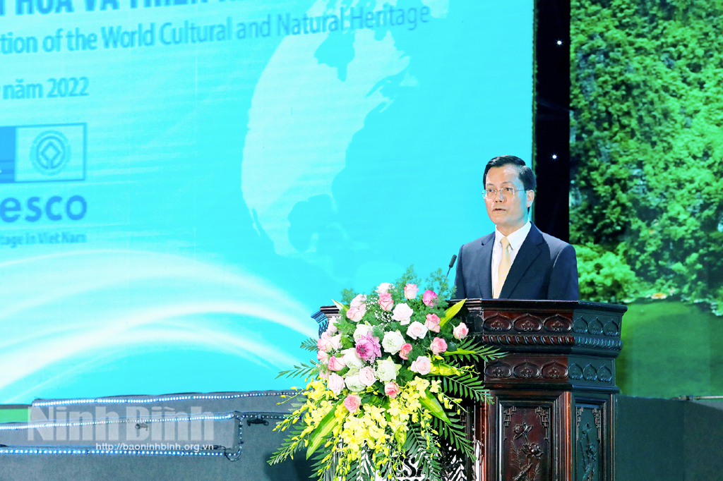 Nhân dịp này, thay mặt Đảng bộ, chính quyền và nhân dân tỉnh Ninh Bình, đồng chí Chủ tịch UBND tỉnh trân trọng cảm ơn các đồng chí lãnh đạo Đảng, Nhà nước, Tổ chức UNESCO, Ủy ban UNESCO Việt Nam, Bộ Văn hóa, Thể thao và Du lịch, Bộ Ngoại giao Việt Nam, Đại sứ quán các nước thành viên UNESCO tại Việt Nam, Hội đồng di sản Quốc gia, lãnh đạo các tỉnh, thành phố, các nhà khoa học, các nhà quản lý cùng cộng đồng dân cư trong vùng di sản đã luôn quan tâm, giúp đỡ tỉnh Ninh Bình thực hiện tốt Công ước về bảo vệ di sản văn hóa và thiên nhiên thế giới, đóng góp quan trọng trong xây dựng, gìn giữ, nâng cao vị thế của tỉnh, đáp ứng mục tiêu phát triển chung của quốc gia và khu vực.