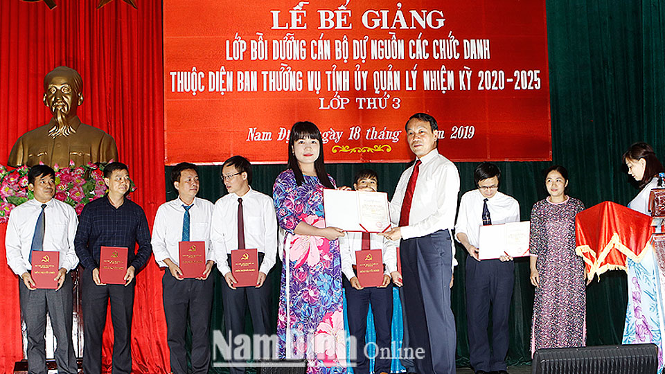 | Đồng chí Nguyễn Văn Va, Ủy viên Ban TVTU, Trưởng Ban Tổ chức Tỉnh ủy trao Giấy chứng nhận cho cán bộ dự nguồn các chức danh thuộc diện Ban TVTU quản lý nhiệm kỳ 2020-2025. |