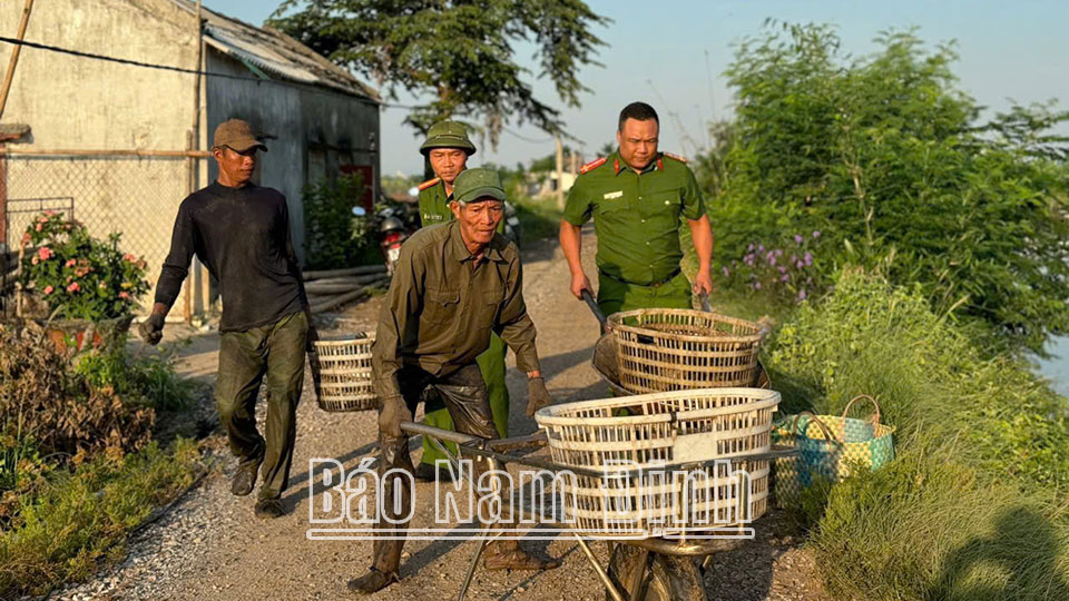 | Lực lượng Công an và lực lượng tham gia bảo vệ an ninh trật tự ở cơ sở hỗ trợ người dân khu vực Cồn Xanh, huyện Nghĩa Hưng thu hoạch thuỷ hải sản. |