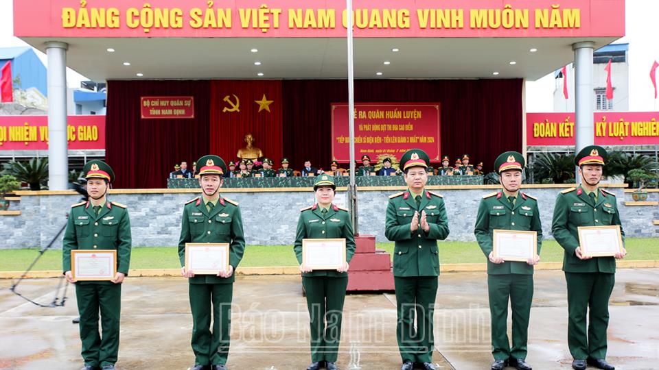 | Đại tá Nguyễn Bá Thịnh, Ủy viên Ban TVTU, Chỉ huy trưởng Bộ CHQS tỉnh trao thưởng cho các tập thể, cá nhân đạt thành tích trong Hội thi mô hình sáng kiến, cải tiến kỹ thuật phục vụ huấn luyện năm 2024. |