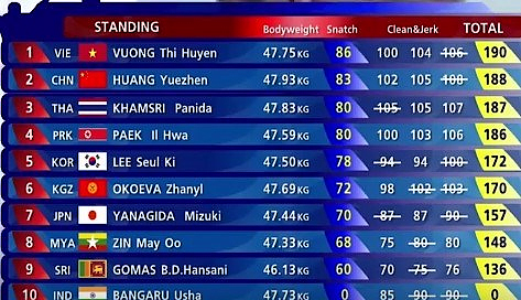 Kết quả này giúp Vương Thị Huyền có được chiếc HCV cử giật với thành tích hơn VĐV xếp thứ hai người Trung Quốc Huang Yuezhen đến 3kg.