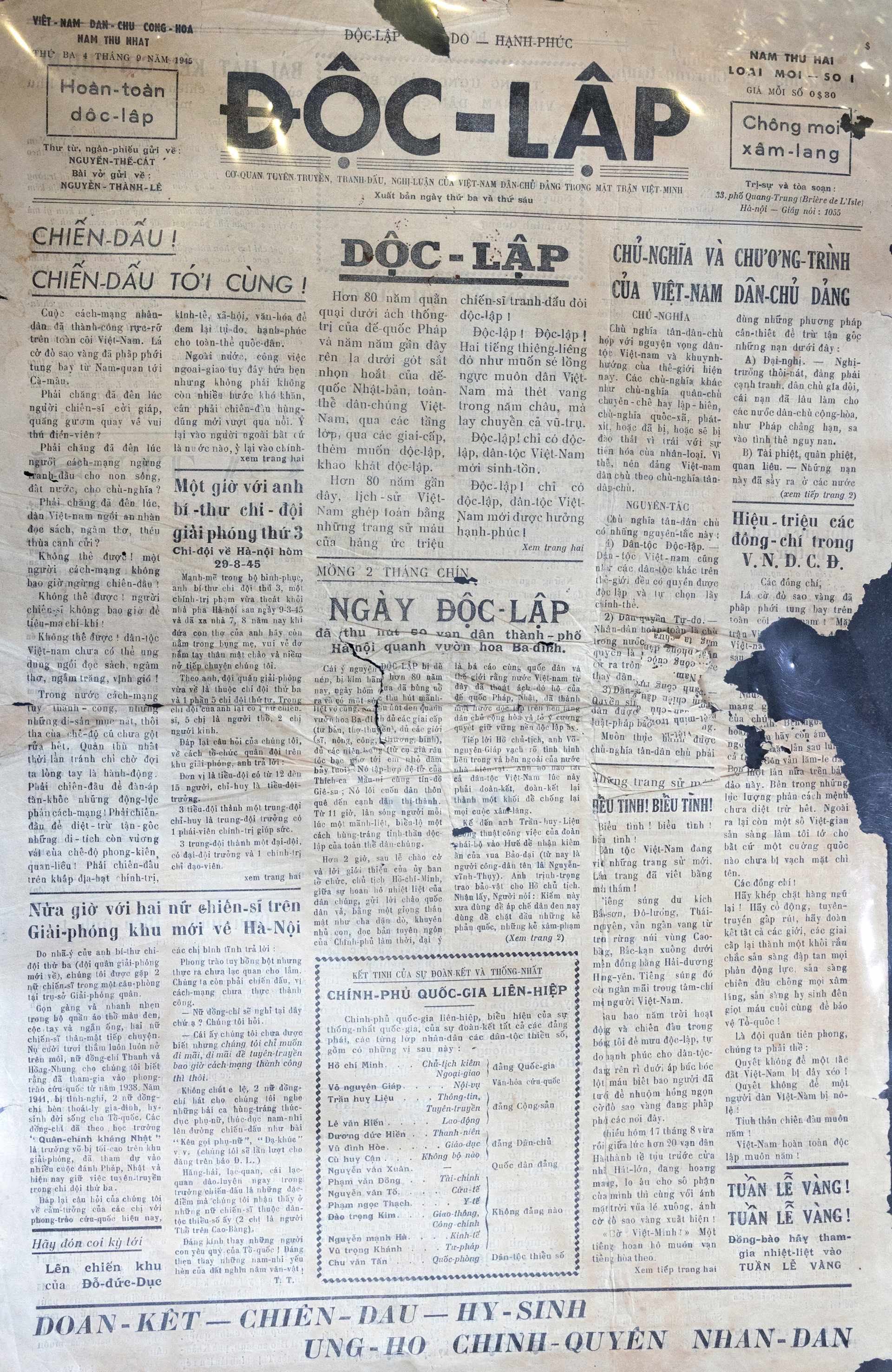 | Tờ báo Độc Lập, số ra ngày mùng 4/9/1945. |