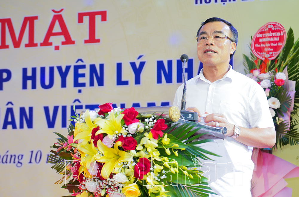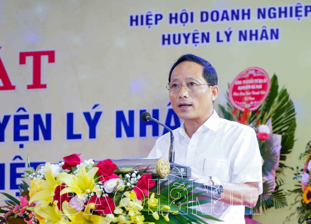 Các đồng chí lãnh đạo Huyện ủy, HĐND, UBND huyện Lý Nhân tặng hoa chúc mừng các doanh nghiệp nhân Ngày Doanh nhân Việt Nam.