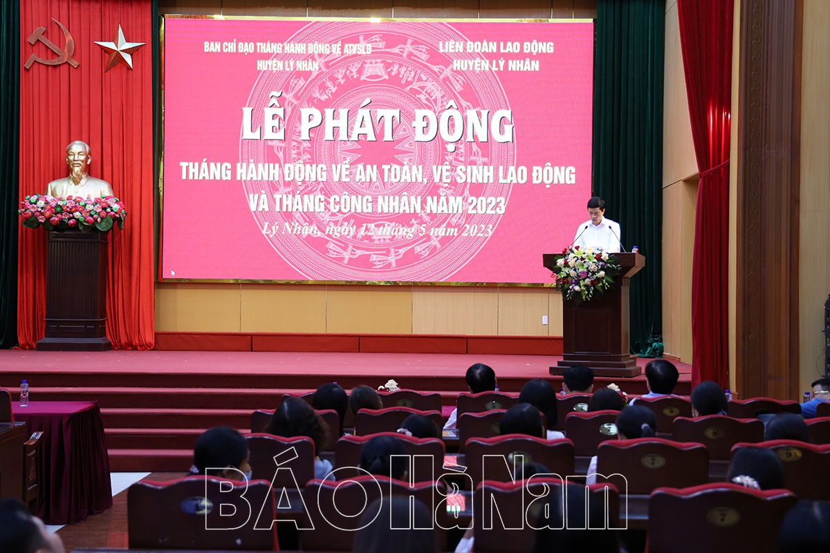 Phát biểu tại lễ phát động, lãnh đạo UBND huyện Lý Nhân khẳng định những năm qua, công tác bảo đảm ATVSLĐ tại các doanh nghiệp, làng nghề, làng có nghề trên địa bàn được triển khai hiệu quả. Tháng hành động về ATVSLĐ, Tháng Công nhân năm 2023 là dịp cao điểm tổ chức các hoạt động chăm lo cho đoàn viên, công nhân viên chức lao động; tuyên truyền, nâng cao ý thức, nhận thức của người sử dụng lao động, người lao động trong việc phòng ngừa, kiểm soát yếu tố nguy hiểm, có hại tại nơi làm việc nhằm cải thiện điều kiện làm việc, chăm lo sức khỏe, phòng bệnh nghề nghiệp, phòng chống dịch Covid-19, phòng chống các dịch bệnh khác, đảm bảo tính mạng của người lao động tại các cơ sở lao động...
