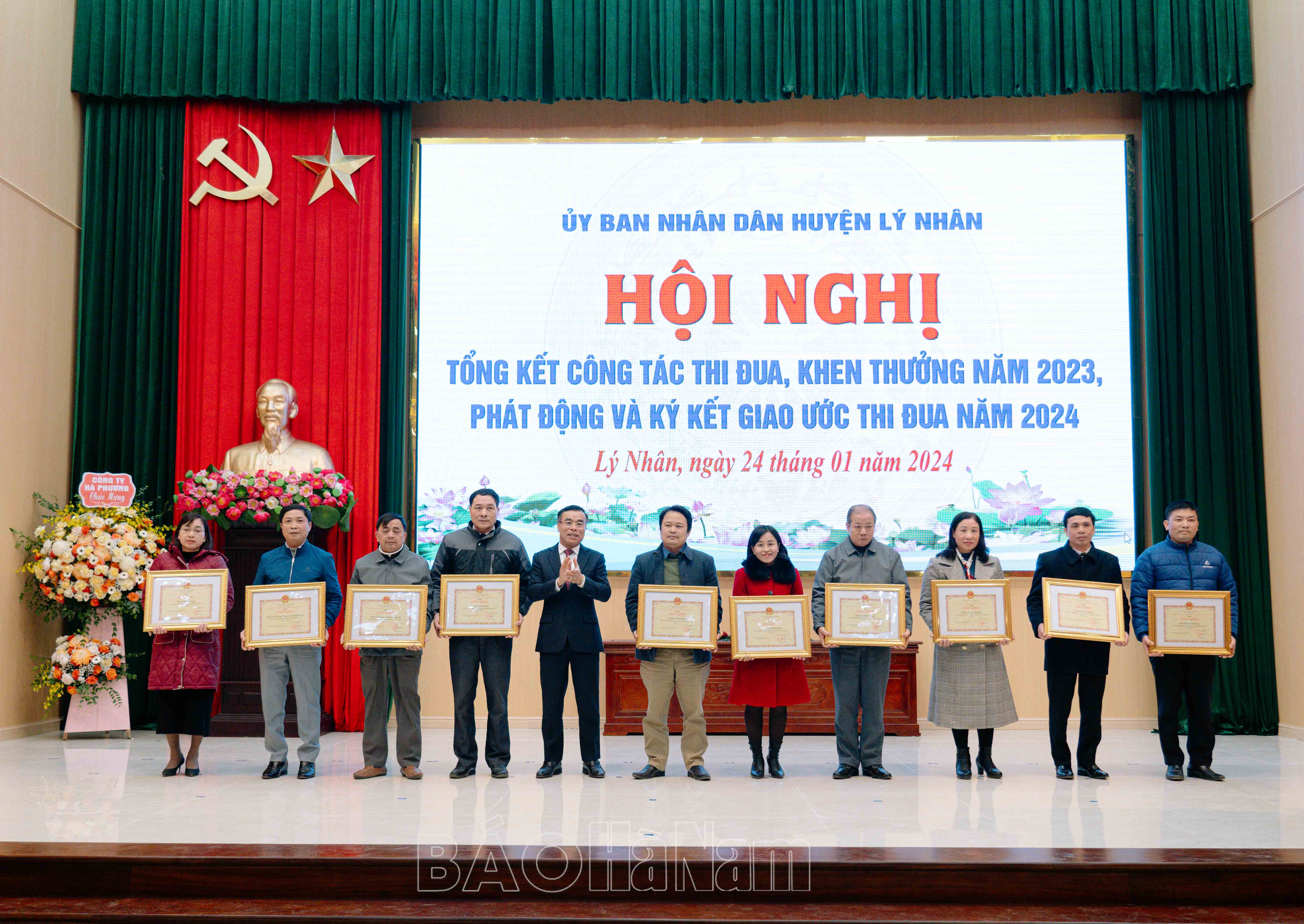 Các tập thể tiêu biểu được nhận Cờ thi đua của Chủ tịch UBND tỉnh.Lãnh đạo Huyện ủy Lý Nhân trao thưởng cho các tập thể có thành tích xuất sắc trong phong trào thi đua năm 2023.