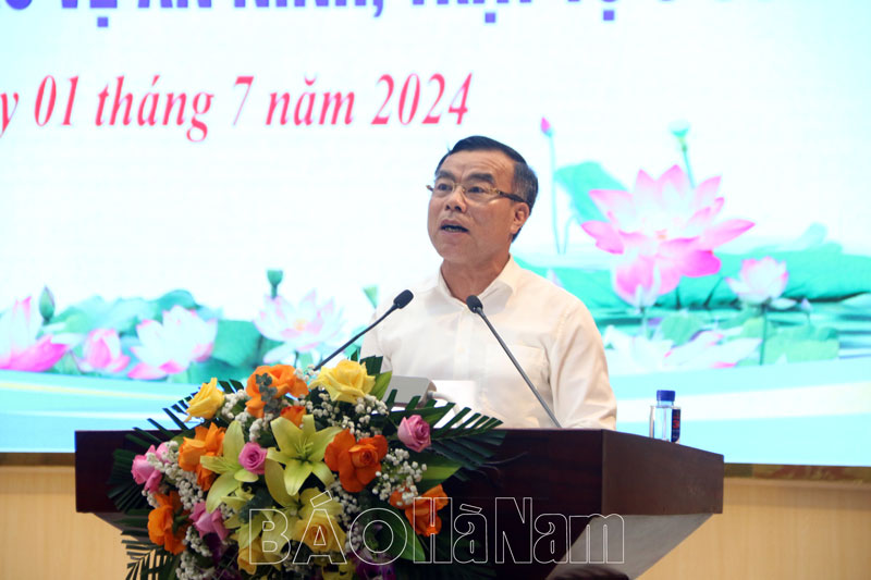 Đại tá Đỗ Hoài Nam, Phó Giám đốc Công an tỉnh phát biểu tại hội nghị.
