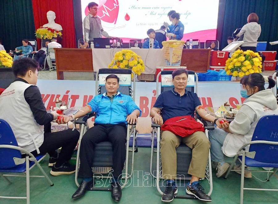 Lãnh đạo Hội CTĐ tỉnh, Hội CTĐ huyện, Huyện đoàn Lý Nhân động viên các tình nguyện viên tham gia hiến máu.