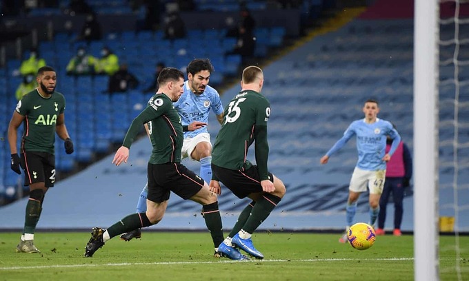 Cú đúp vào lưới Tottenham giúp Gundogan có bàn thứ 11 trong vòng chưa đầy hai tháng ở Ngoại hạng Anh. Nhạc trưởng Man City cũng giúp đội nhà vững ngôi đầu bảng với 53 điểm sau 23 vòng, hơn đội nhì bảng Leicester bảy điểm.