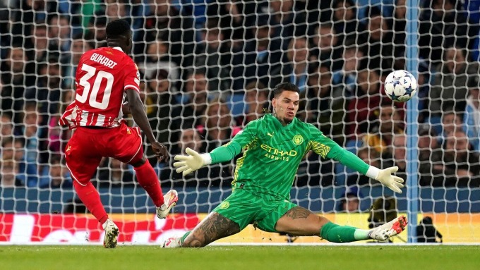 Bukari (đỏ) hạ gục Ederson trong pha đối mặt cuối hiệp một.