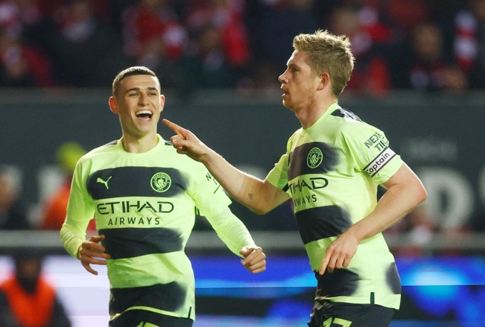 De Bruyne (phải) mừng bàn ấn định chiến thắng cùng Foden.