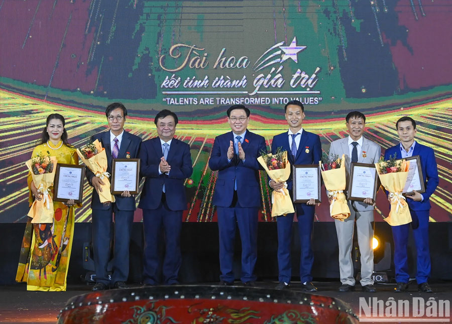 Chủ tịch Quốc hội Vương Đình Huệ và Bộ trưởng Bộ NN-PTNT Lê Minh Hoan trao giải Hội thi sản phẩm thủ công mỹ nghệ Việt Nam năm 2023 cho nhiều nghệ nhân tiêu biểu (ảnh: Doãn Tấn/TTXVN)