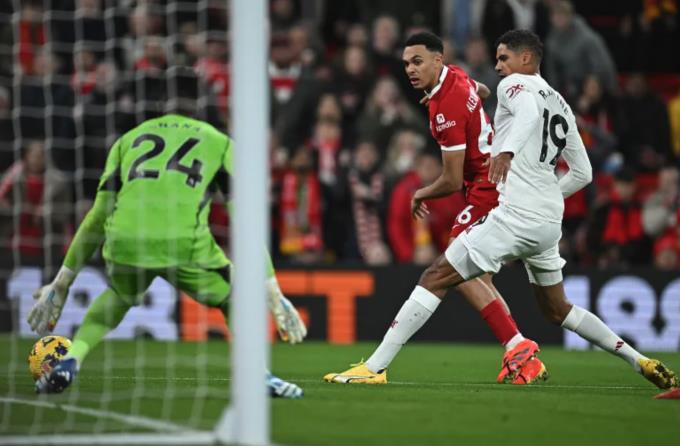 Liverpool cũng có lý do để tiếc nuối, khi cú sút xa của Alexander-Arnold đi chệch cột gang tấc. Phút 76, Nunez và Luis Diaz khuấy đảo trong vòng cấm Man Utd nhưng cả Onana lẫn Amrabat đều lăn xả để giải nguy. Phút 85, Liverpool đòi phạt đền sau tình huống để bóng chạm tay trong vòng cấm của Luke Shaw. Nhưng VAR không mất nhiều thời gian để xác định hậu vệ Man Utd không có tư thế bất thường khi tình huống xảy ra.
