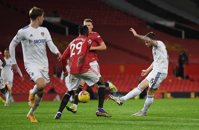 Hơn 100 giây sau, McTominay hoàn tất cú đúp nhanh nhất trong lịch sử Ngoại hạng Anh. Anh nước rút từ tuyến dưới, vượt qua lớp phòng ngự áo trắng, rồi đón đường chọc khe của Anthony Martial. Trong thế đối mặt, số 39 của Man Utd sút chéo góc bằng chân trái, khiến Meslier vào lưới nhặt bóng lần thứ hai.