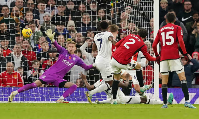 Man Utd chỉ xuyên phá hàng thủ Luton nhờ vào tình huống cố định và chút may mắn. Quả phạt góc của Bruno Fernandes bị đội khách phá ra, tới chân Mason Mount. Tiền vệ người Anh chuyền xuống cấm địa bên phải cho Marcus Rashford căng ngang trúng chân cầu thủ Luton bật ra. Bóng rơi đúng tầm để Victor Lindelof lao vào sút căng về chính giữa khung thành, mở tỷ số.