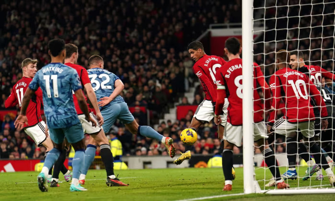 Cú sút của Garnacho (phải) bị Diego Carlos (thứ hai từ phải sang) làm đổi hướng bóng vào lưới.