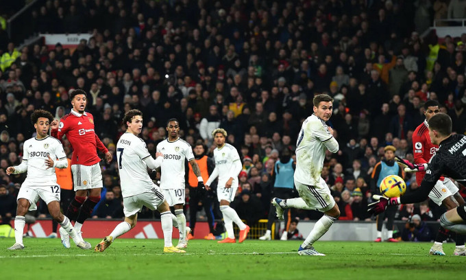 Leeds suýt ghi thêm bàn nữa chỉ sau ba phút, khi tiền vệ Brenden Aaronson sút phạt qua hàng rào dội cột dọc bật ra. Thay vào đó, Man Utd gỡ hoà ở phút 70 với công đầu thuộc về Luke Shaw. Hậu vệ trái của Man Utd ngoặt bóng vượt qua hai cầu thủ, rồi kéo bóng phối hợp với Sancho. Quả tạt của Shaw không tốt, nhưng bóng bật ra đúng tầm Sancho lao vào, rồi tiền vệ người Anh đặt lòng về góc xa đánh bại Meslier.