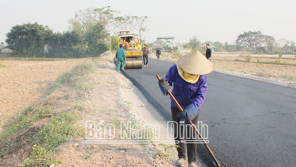 | Thi công nâng cấp tuyến đường đê Ất Hợi trên địa bàn huyện Mỹ Lộc. |