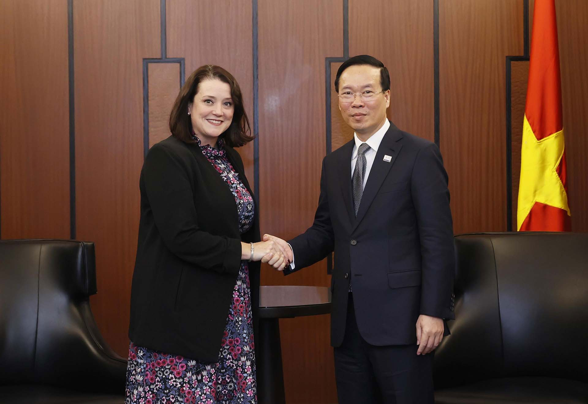 Trong khuôn khổ chương trình tham dự Tuần lễ Cấp cao Diễn đàn Hợp tác kinh tế châu Á-Thái Bình Dương (APEC) 2023 và kết hợp hoạt động song phương tại Hoa Kỳ, chiều 15/11, Chủ tịch nước Võ Văn Thưởng đã gặp mặt Thống đốc bang California Gavin Newsom và Phó Thị trưởng Los Angeles Erin Bromaghim.