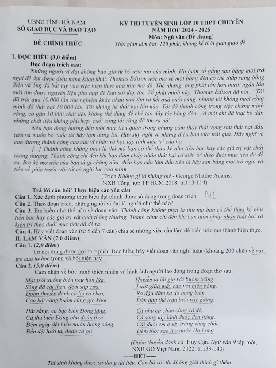 Đề thi gồm 2 phần, đọc hiểu (3 điểm) và làm văn (7 điểm). Phần một đề thi trích đoạn văn “Không gì là không thể” của Goerge Matthe Adams, yêu cầu thí sinh xác định phương thức biểu đạt chính được sử dụng trong đoạn trích, và nêu được thông điệp cốt lõi của đoạn văn: “Thành công không phải là thứ bạn kế thừa mà bạn có thể thừa kế như tiền bạc hay các giá trị vật chất thông thường. Thành công chỉ đến khi bạn dám chấp nhận thất bại và kiên trì theo đuổi mục tiêu đã đề ra”.