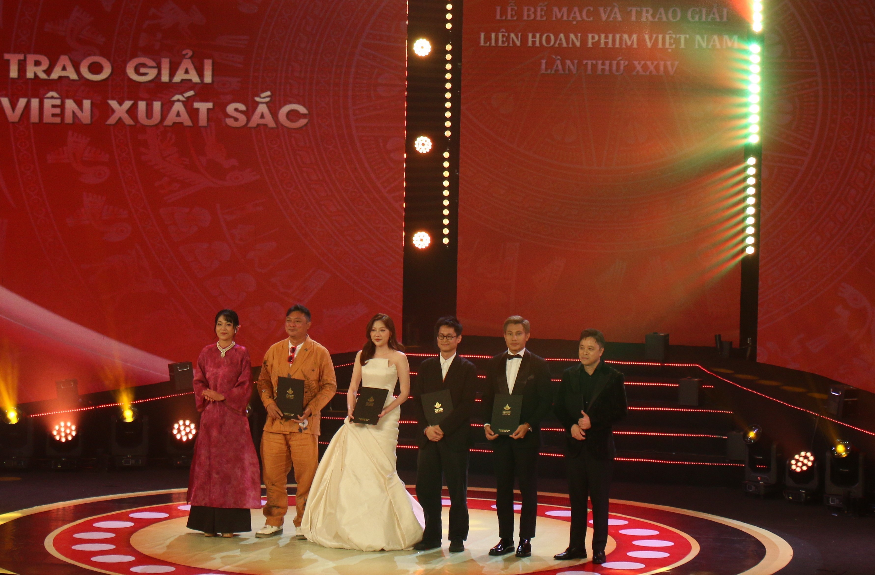 Đạo diễn Victor Vũ và diễn viên Đinh Y Nhung trao giải cho các Nam và Nữ diễn viên chính xuất sắc, Nam và nữ diễn viên phụ xuất sắc trong phim truyện điện ảnh. Ảnh: Thu Hương - TTXVN