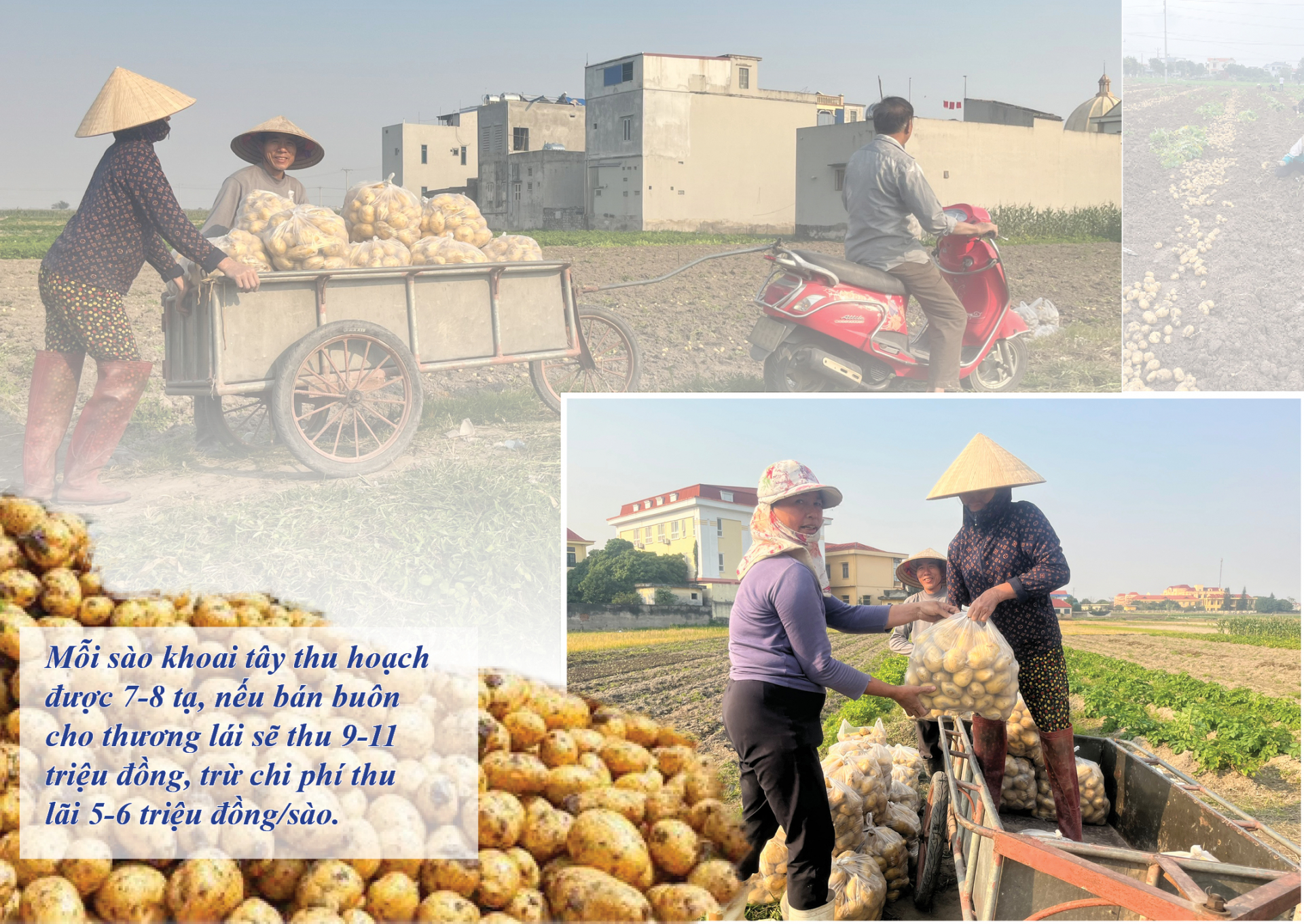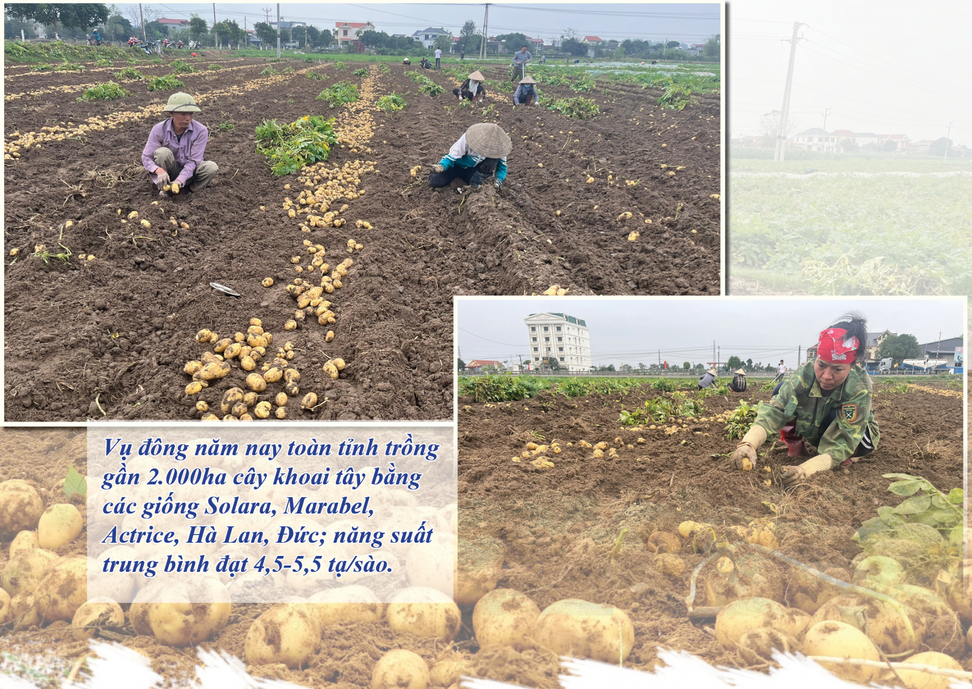 rong cái rét ngọt của những ngày cuối năm, chúng tôi tìm về các “thủ phủ” khoai tây tại các xã: Nam Dương, Nam Hùng, Nam Hoa (Nam Trực); Liên Bảo, Thành Lợi, Liên Minh (Vụ Bản); Yên Nhân, Yên Khang, Yên Đồng (Ý Yên)… và ở đâu cũng chứng kiến cảnh nông dân đang tất bật thu hoạch. Bà Nguyễn Thị Nhung, thôn 14, xã Yên Nhân, 55 tuổi, đã có mấy chục năm gắn bó với cây lúa, củ khoai. Bà Nhung cho biết: Tôi biết đến cây khoai tây từ khi còn rất nhỏ. Nhưng ngày ấy trồng khoai tây không được năng suất như bây giờ do phương pháp, kỹ thuật trồng, giống kém chất lượng… 3 năm trở lại đây, nhiều giống khoai mới như Solara, Marabel, Actrice, Hà Lan, Đức được các HTX nông nghiệp và bà con nông dân đưa vào trồng. Những giống này có nhiều ưu điểm như năng suất, chất lượng cao, chống chịu tốt với điều kiện thời tiết diễn biến cực đoan, có khả năng kháng bệnh tốt, sinh trưởng và phát triển mạnh mẽ, phù hợp với điều kiện thổ nhưỡng của địa phương. Bởi vậy, cây khoai đông đang trở thành cây trồng chủ lực ở các địa phương, được bà con “ưu ái” hơn hai vụ lúa bởi hiệu quả kinh tế cao hơn hẳn.
