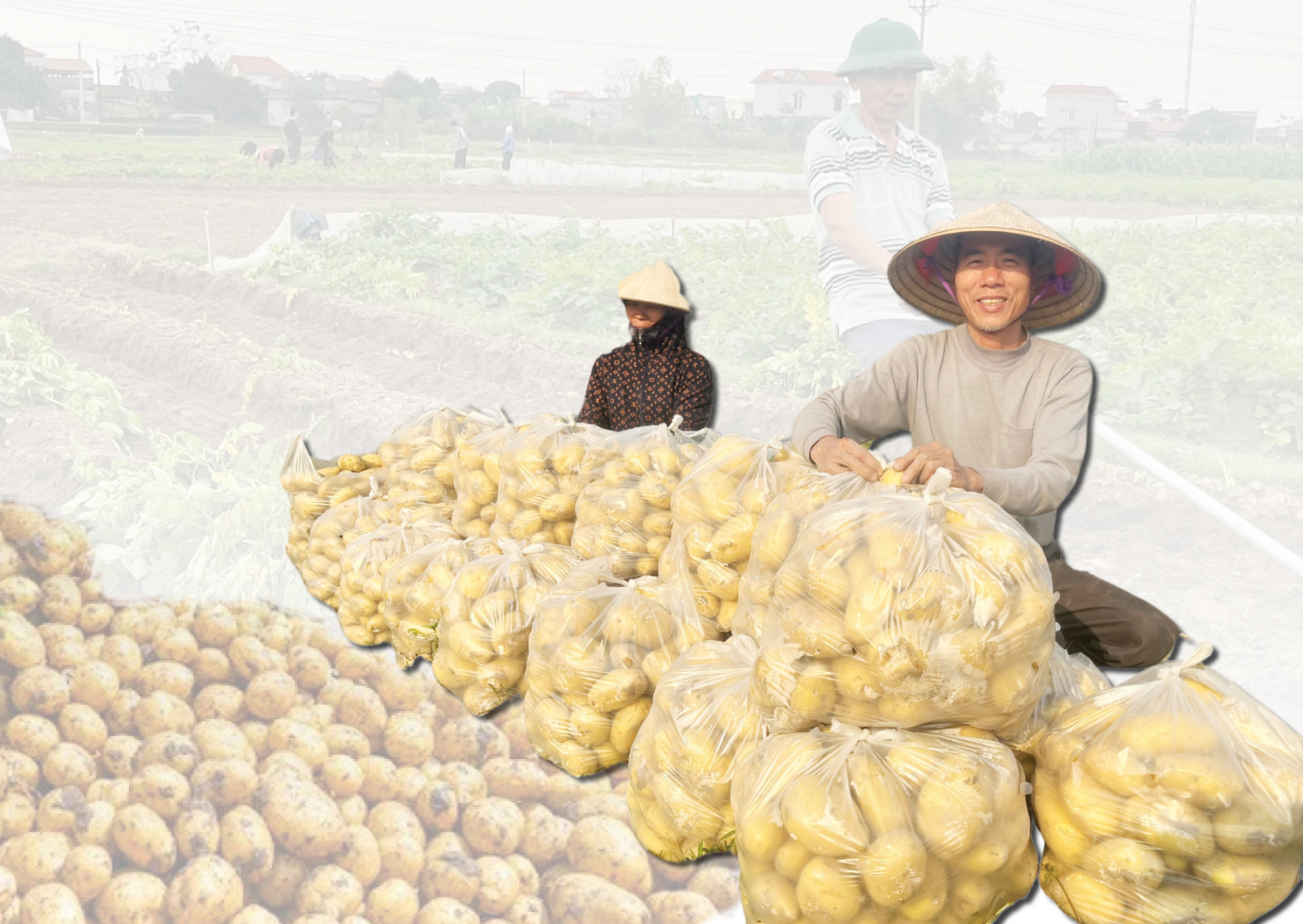 | Khoai tây thịt được nông dân xã Nam Dương (Nam Trực) thu gom vào túi ni-lông để bán cho các thương lái. |