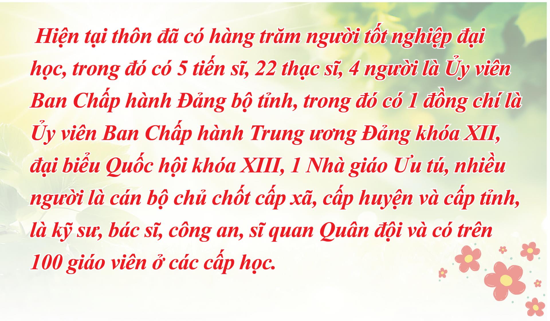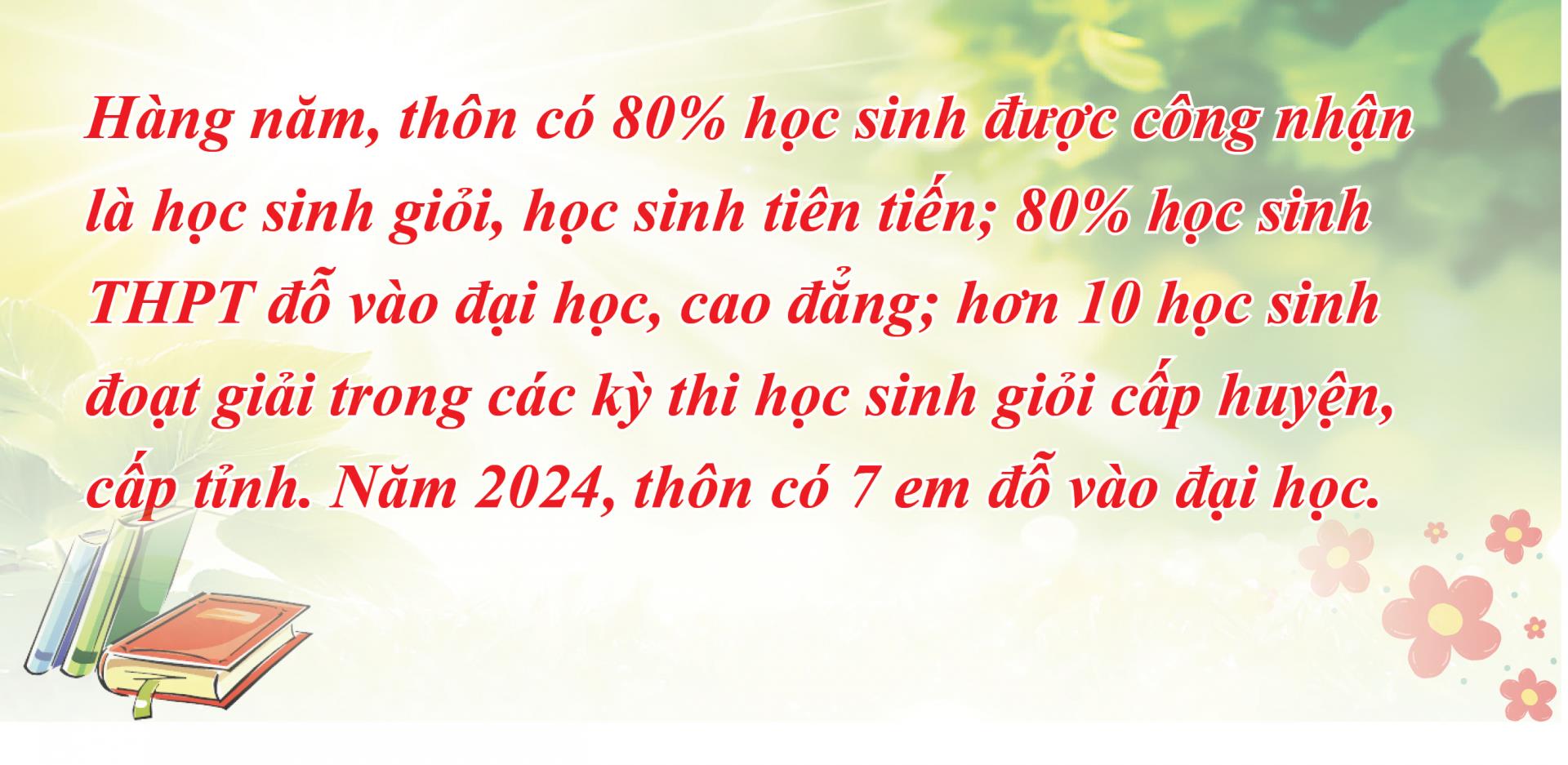 Nhờ sự động viên, tuyên truyền của chi hội khuyến học cùng với động lực thi đua giữa các gia đình, số học sinh trong thôn đạt kết quả xuất sắc trong học tập, rèn luyện đã được nâng lên rõ rệt. Nhiều học sinh có hoàn cảnh khó khăn đã được động viên giúp đỡ kịp thời để thực hiện ước mơ vươn tới tầm cao tri thức. Hàng năm, thôn có 80% học sinh được công nhận là học sinh giỏi, học sinh tiên tiến; 80% học sinh THPT đỗ vào đại học, cao đẳng; hơn 10 học sinh đoạt giải trong các kỳ thi học sinh giỏi cấp huyện, cấp tỉnh. Năm 2024, thôn có 7 em đỗ vào đại học. Hiện tại thôn đã có hàng trăm người tốt nghiệp đại học, trong đó có 5 tiến sĩ, 22 thạc sĩ, 4 người là Ủy viên Ban Chấp hành Đảng bộ tỉnh, trong đó có 1 đồng chí là Ủy viên Ban Chấp hành Trung ương Đảng khóa XII, đại biểu Quốc hội khóa XIII, 1 Nhà giáo Ưu tú, nhiều người là cán bộ chủ chốt cấp xã, cấp huyện và cấp tỉnh, là kỹ sư, bác sĩ, công an, sĩ quan Quân đội và có trên 100 giáo viên ở các cấp học. Năm 2024, thôn đã có 150 gia đình đạt danh hiệu “Gia đình học tập”. Thôn đã vinh dự được Trung ương Hội Khuyến học Việt Nam, UBND tỉnh tặng Bằng khen. Để lan tỏa và tiếp nối truyền thống hiếu học của quê hương, hàng năm, mỗi độ xuân về, các cụ cao niên trong làng lại cùng các ban, ngành, đoàn thể và toàn thể nhân dân quây quần tại nhà văn hóa của thôn trò chuyện, khen thưởng, động viên những tấm gương học sinh chăm ngoan hiếu học, những em có hoàn cảnh khó khăn biết vươn lên trong rèn luyện và học tập, thu hút mọi người, mọi nhà, các đoàn thể cùng tiếp tục quan tâm ươm những “mầm xuân” của thôn ngày một vươn cao.