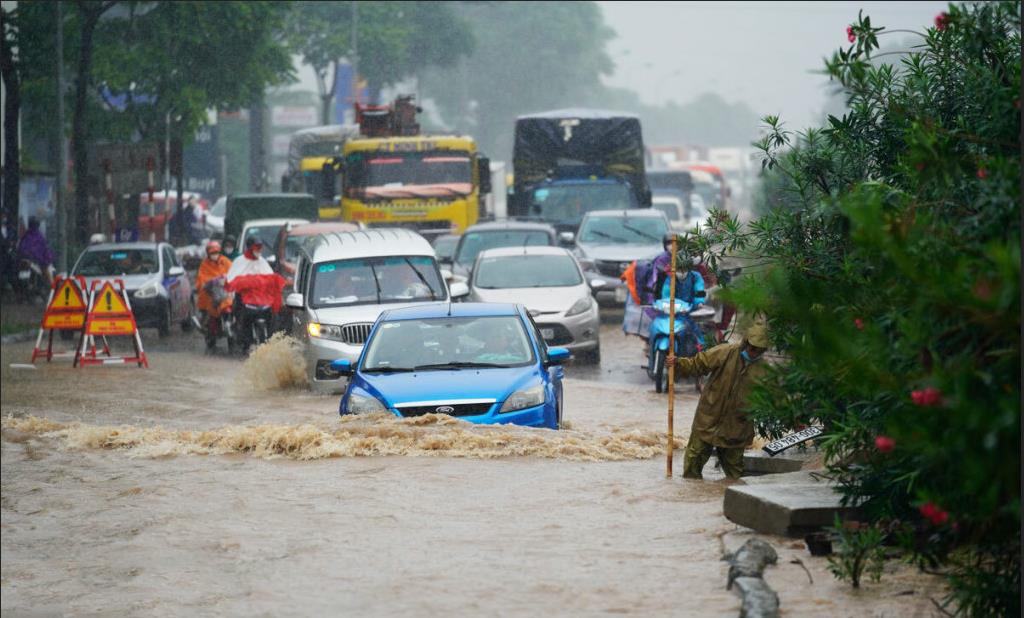 Đường gom đại lộ Thăng Long, Hà Nội ngập vào tháng 5/2022.