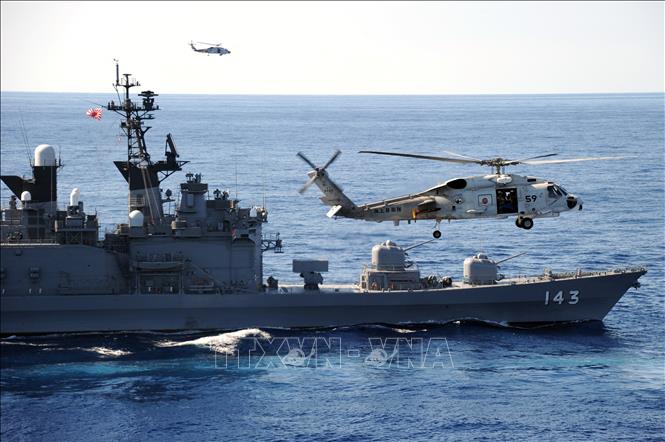 Trực thăng của lực lượng phòng vệ biển Nhật Bản và tàu khu trục Shirane tham gia cuộc tập trận "Keen Sword" Nhật Bản - Mỹ trên Thái Bình Dương.