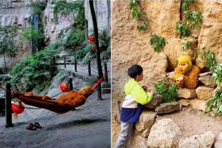 Mạng xã hội Trung Quốc cũng xuất hiện nhiều đoạn clip ghi lại cảnh một người mặc bộ áo choàng màu vàng đặc trưng của Tôn Ngộ Không nằm trong miệng hang, liên tục ăn các món như mì gói, táo, chuối… từ tay du khách.