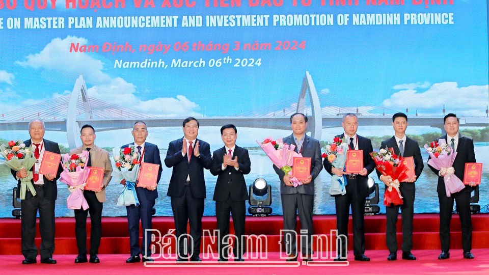 | Các đồng chí: Phạm Gia Túc, Ủy viên BCH Trung ương Đảng, Bí thư Tỉnh ủy; Phạm Đình Nghị, Phó Bí thư Tỉnh ủy, Chủ tịch UBND tỉnh trao chứng nhận đăng ký đầu tư vào KCN Dệt may Rạng Đông, tại Hội nghị công bố Quy hoạch tỉnh và Xúc tiến đầu tư tỉnh Nam Định năm 2024. Ảnh: Viết Dư |